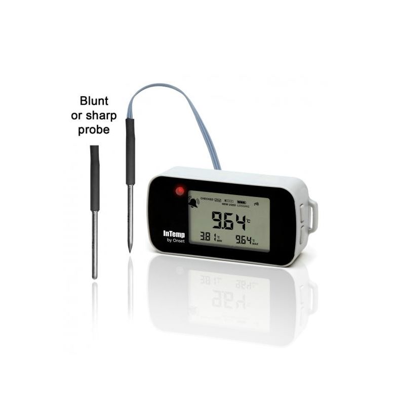 The InTemp ® CX402-TxM data logger with 2m or 4m length temperature probe monitoring temperatures in refrigerators, freezers, and other temperature-controlled environments to comply with global GDP requirements. The logger communicates wirelessly via Bluetooth Low Energy to mobile devices. Using the InTemp app, you can easily view data, check logger status, set alarms, and create and share secure PDF reports for streamlined reporting and regulatory compliance. The CX402-TxM features a built-in LCD display to view ambient temperature, advanced audible and visual alarm capabilities for notification of temperature excursions, an internal sensor for ambient temperature monitoring, and a single-point NIST Certification of Calibration for both the logger body and probe.