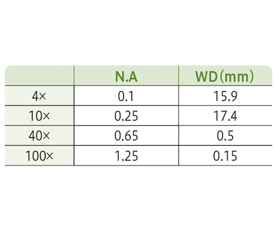 - Objective lens: 4x/NA0.1, 10x/NA0.25, S40x/NA0.65, S100x/NA1.25 (oil)