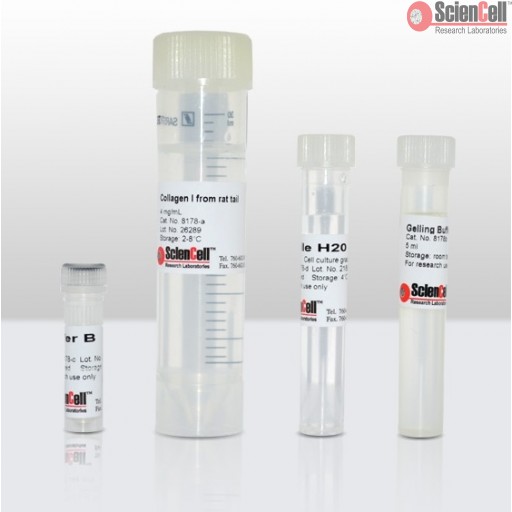 The ScienCell collagen I-3D Gelling kit includes collagen I purified from rat tail tendon by a modification of the method of Bell et al1 and supplied as a sterile liquid in 1/1000 acetic acid. It also includes a 10X Gelling Buffer, which can be used to adjust the pH and ionic strength of the collagen I solution to allow for the formation of a homogenous gel.
