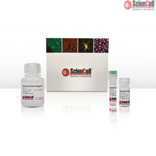 ScienCell's Malachite Green Phosphate Assay provides a simple colorimetric method for the determination of inorganic, soluble phosphate concentrations based on the complexation of malachite green oxalate with phoshomolybdate under acidic conditions. Applications of the kit include measurement of phosphate release, quantification of protein- or lipid- phosphorylation and etc.